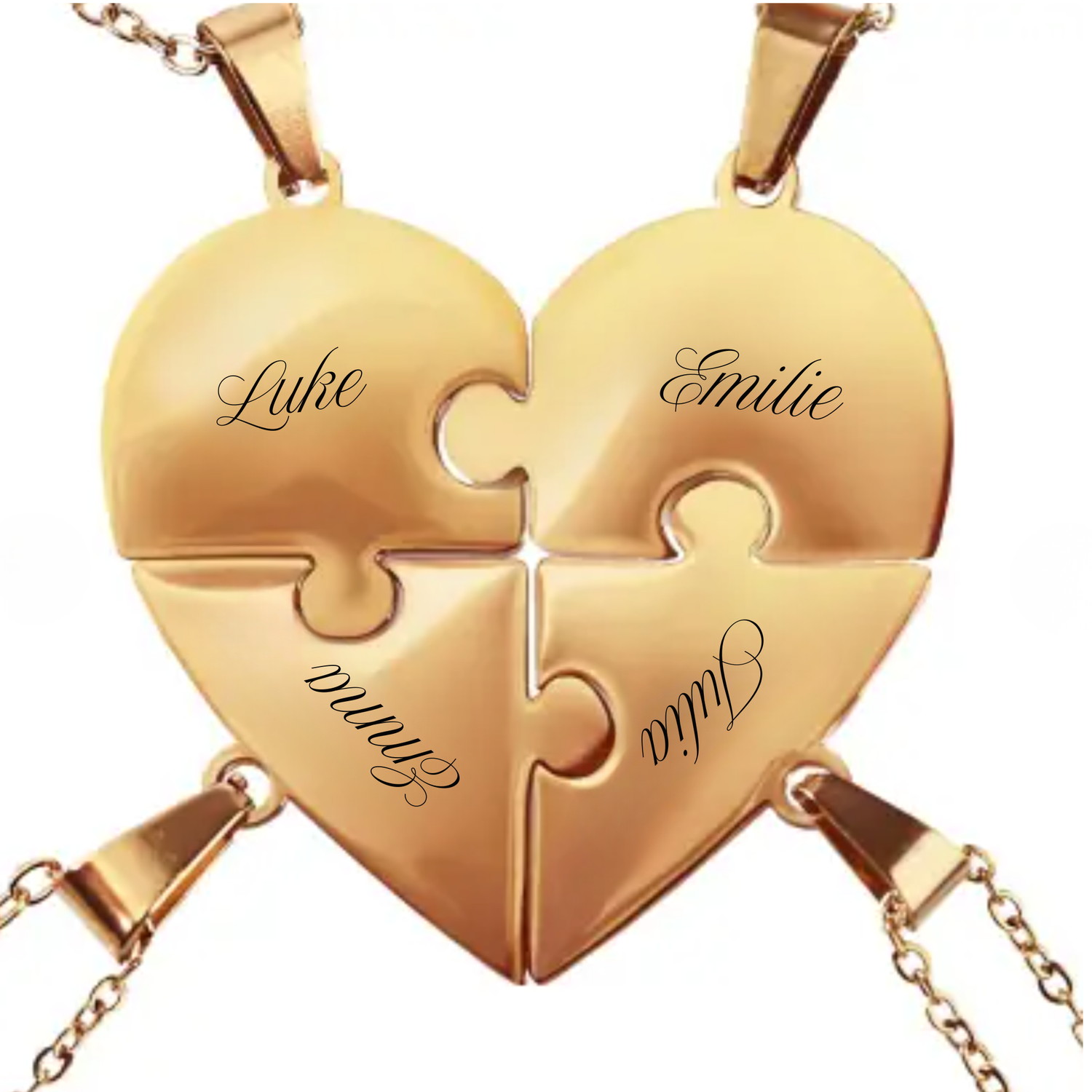 Le Collier Puzzle Personnalisé Eternia™ réunit les prénoms qui comptent dans un cœur qui s’assemble pièce par pièce. Chaque segment est gravé avec précision pour représenter un lien, une histoire, une personne que l’on garde près du cœur.